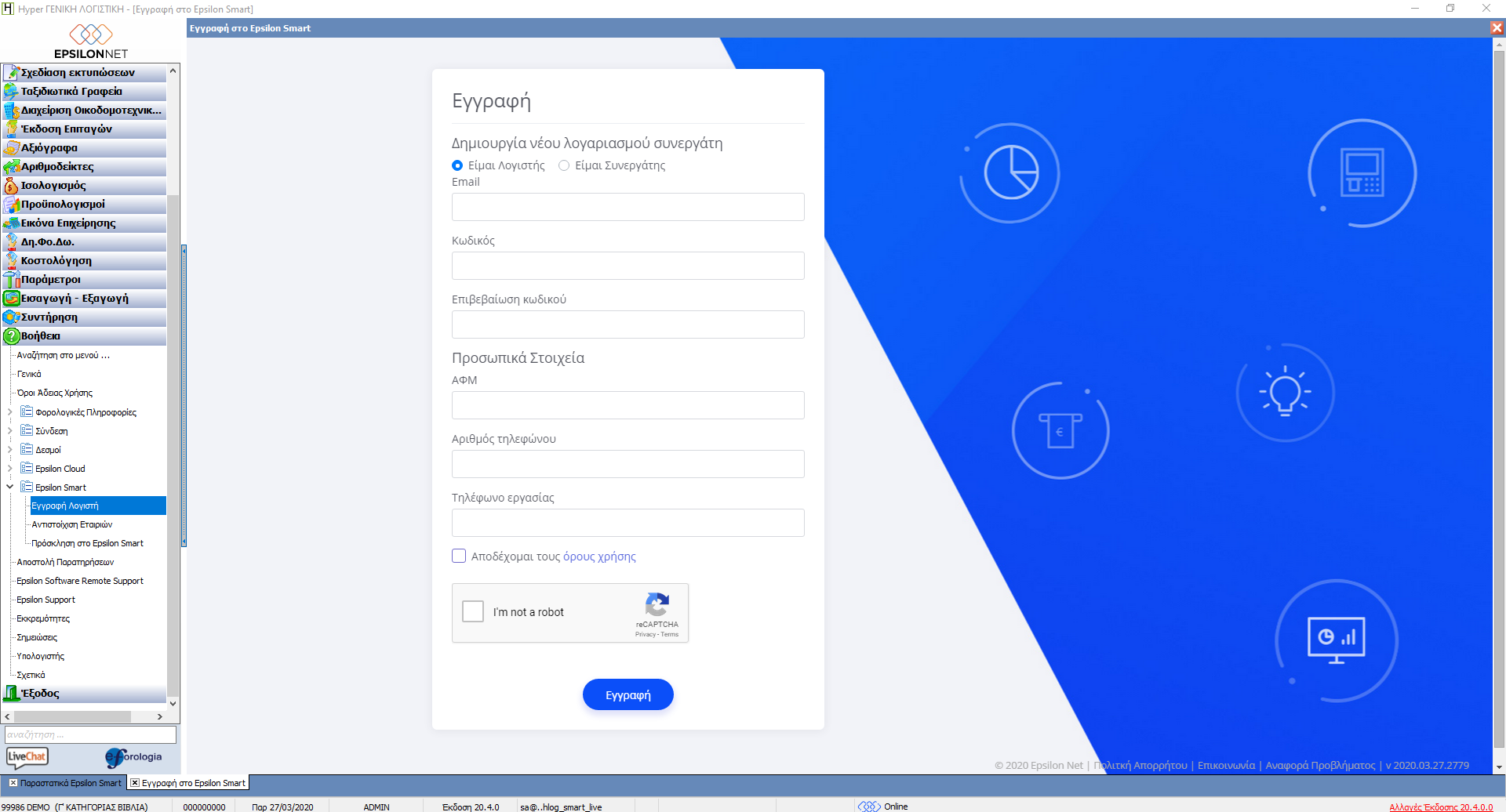 Υπάρχει αμφίδρομη σύνδεση με το λογιστικό γραφείο. Το λογιστικό πρόγραμμα μπορεί στείλει τους συναλλασσόμενους της εταιρείας στην εφαρμογή Smart και το Smart μπορεί να ενημερώσει το λογιστικό πρόγραμμα online με τις κινήσεις που καταχωρούνται.