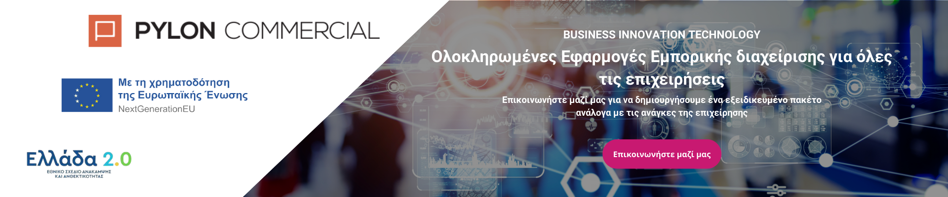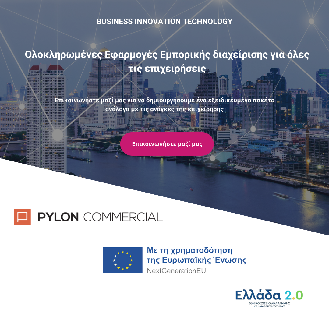 Το PYLON Commercial είναι μία εφαρμογή μηχανογράφησης νέας γενιάς που εξυπηρετεί τις διαχρονικές ανάγκες των εμπορικών επιχειρήσεων, αλλά και, μέσα από την πολυετή εμπειρία και μελέτη, θέτει νέα standard στο τρόπο που αυτά θα λειτουργούν στο μέλλον.