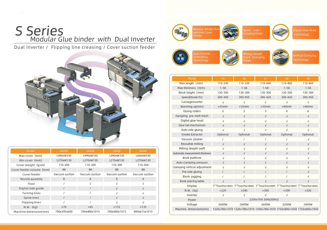 Eπαγγελματικά ημιαυτόματα επιδαπέδια μηχανήματα περιμετρικής θερμοκόλλησης (perfect binding) με δυνατότητα in-line σύνδεσης vacuum τροφοδότη εξωφύλλων με ή χωρίς μονάδα πικμανσης σε δεύτερο χρόνο. Μέγιστο πάχος ράχης 58mm ( έως και 580 φύλλα 80gsm), δυνατότητα χρήσης εξωφύλλων έως και 400gsm στην χειροκίνητη τροφοδοσία και 110-300gsm στον παρελκόμενο αυτόματο τροφοδότη. Μέγιστου ύψους βιβλίου 440mm (εκδόσεις S7) ή 460mm (έκδοση S8 & S9), μεγάλη ταχύτητα βιβλιοδεσίας (420 βιβλία/ώρα στις εκδόσεις S7 & S8 και 450 στις εκδόσεις S6 & S9), αυτοματοποιημένο και απόλυτα διαβαθμιζόμενο σύστημα ρύθμισης χρόνου και έντασης της πίεσης στην πρέσα της πίκμανσης των εξωφύλλων (για τέλεια τετραγωνισμένη ράχη, ακόμη και σε βιβλία πολύ μικρής ράχης), side-glueing, αυτόματο και ρυθμιζόμενο “αγρίεμα” (roughening) της ράχης, ισχυρότατη κόλληση ακόμη και σε δύσκολες ποιότητες χαρτιού, στιβαρή ποιότητα κατασκευής, πολύ εύκολη και φιλική προς τον χρήστη λειτουργία μέσω touch-screen panel 7 ιντσών.