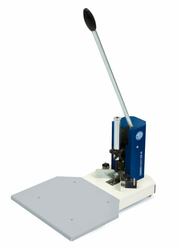 Επαγγελματικός επιτραπέζιος γωνιοκόπτης με δυνατότητα κοπής 40mm / 400 φύλλων 80gsm, με γωνία (RADIUS) 4mm ή 6mm ή 9mm ή 12mm ή 18mm ή φαλτσογωνίας 28mm (45ο) κατόπιν παραγγελίας. Αυτόματο πρεσσάρισμα των φύλλων, οδηγούς γωνιάσματος με μικρορύθμιση ακριβείας, εύκολη αλλαγή των μαχαιριών, εξολοκλήρου στιβαρή μεταλλική κατασκευή.