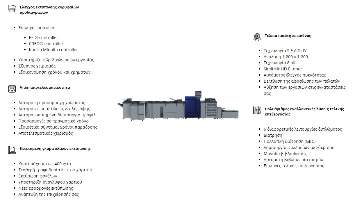 • Ευελιξία με εξειδικευμένες επιλογές τελικής επεξεργασίας, όπως δημιουργία φυλλαδίων, βιβλιοδεσία και αυτόματη βιβλιοδεσία σπιράλ