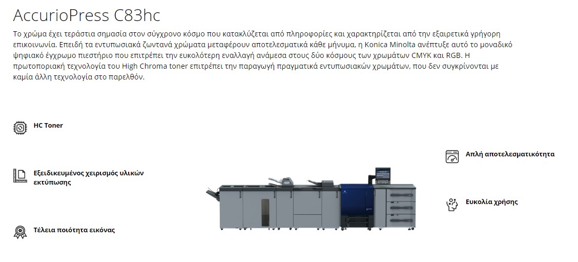• Επαγγελματικές δυνατότητες χειρισμού υλικών εκτύπωσης και τελικής επεξεργασίας: προηγμένη διαχείριση υλικών εκτύπωσης για χαρτί έως 350 gsm και ευέλικτες λειτουργίες τελικής επεξεργασίας, όπως δημιουργία φυλλαδίων, διάτρηση, ένθεση φύλλων μετά την παραγωγή