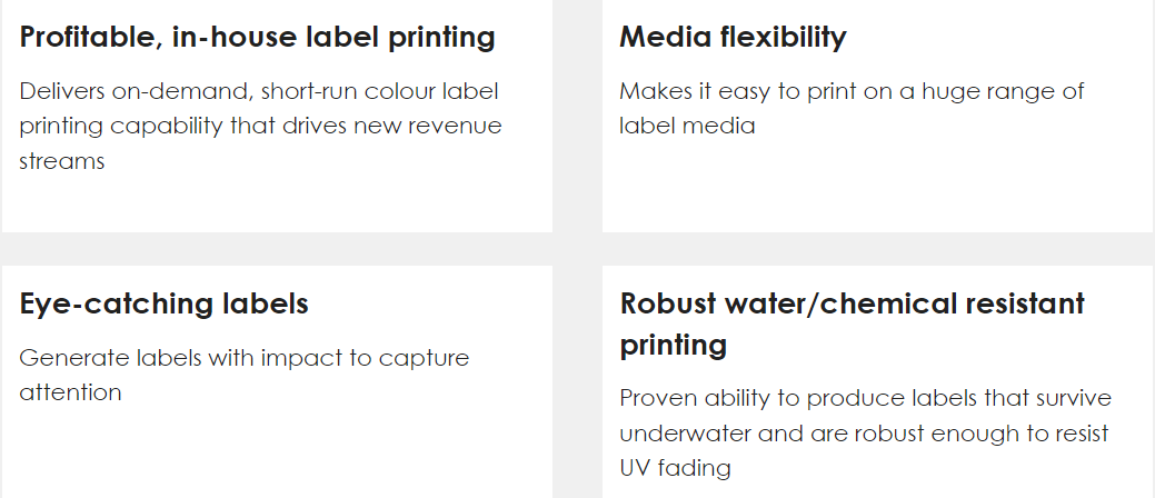 Ο Pro1040 Label Printer προσφέρει επαγγελματική τετράχρωμη εκτύπωση στενού σχήματος σε μια σειρά διαφορετικών μέσων ετικετών, συμπεριλαμβανομένων χαρτιών με υφή και συνθετικών υλικών. Αποκτήστε πρόσβαση σε νέες πηγές εσόδων με υπηρεσίες έγχρωμης εκτύπωσης ετικετών.